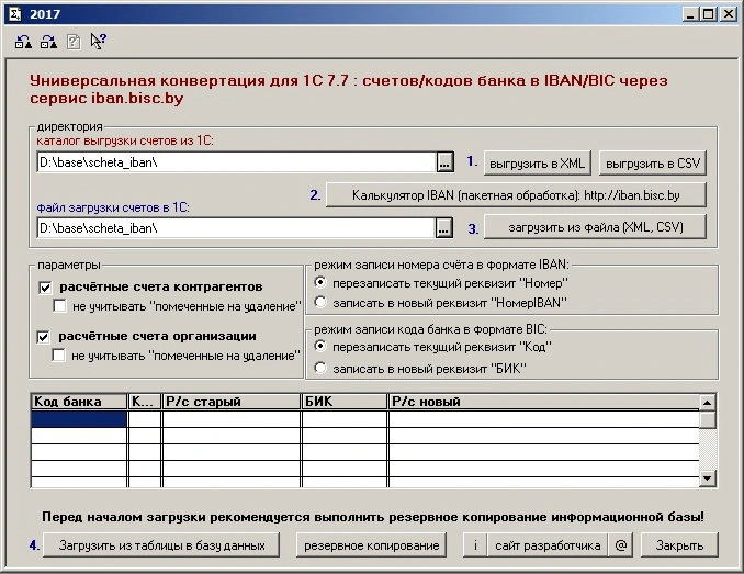 Подготавливает и выгружает данные расчётных счетов контрагентов и организации в формате XML и CSV для загрузки на сайт "Калькулятор IBAN": http://iban.bisc.by/. И загружает обработанный файл (расчётные счета и коды банков в формате IBAN/BIC) в 1С согласно заданным на форме параметрам и режимам. Имеется встроенных механизм обработки ошибок.