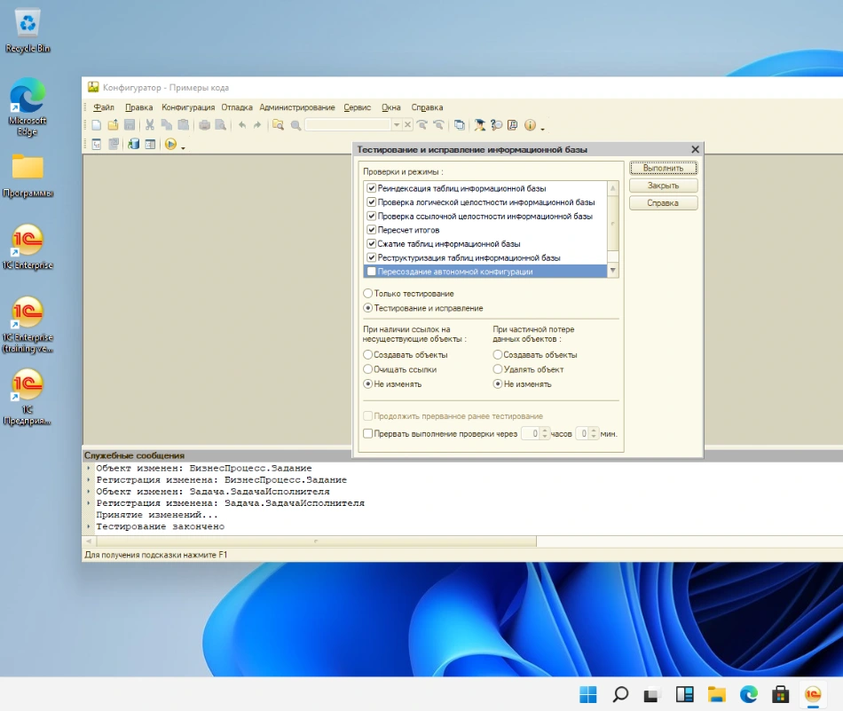 Начинаем с конфигуратора и встроенного механизма тестирование и исправление файловой информационной базы данных (весом в пол гигабайта). От начала до конца тестирования со всеми галками (кроме последней), "пролетает" за пару минут. Значит в ОС файловая система осталась сродни десятке и каких-то критических изменений не получила. Это радует.