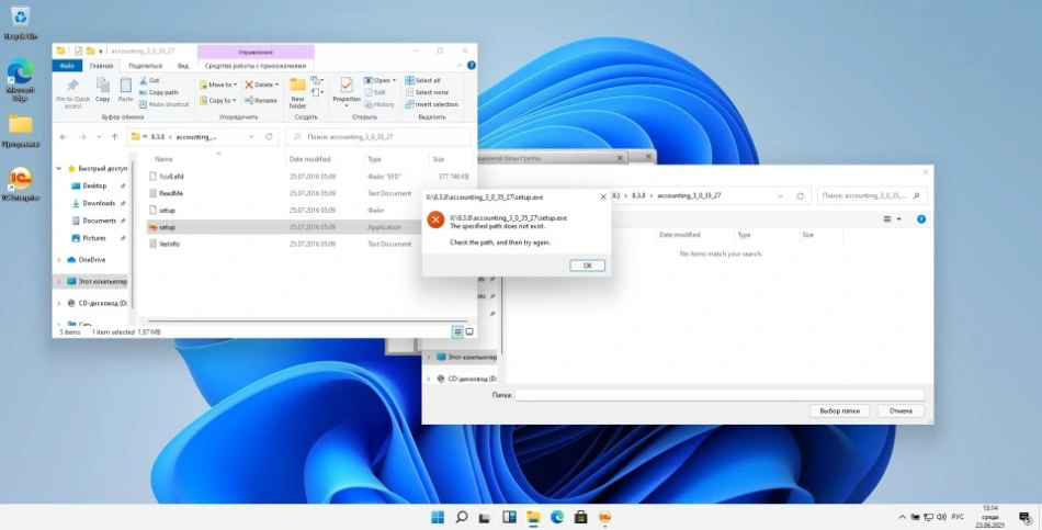 Ставлю 8.3.8 (Учебную версию) под администратором с подключенного диска из основной ОС и получаю ошибку "Check the path, and then try again.". Скорее всего ошибка из-за того, что Windows 11 не может определить права на папку. Копирую на диск C: и инсталлирую без проблем.