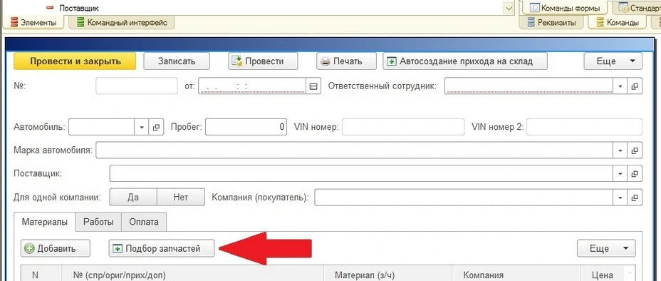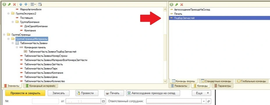 1. В командах формы создадим процедуру «ПодборЗапчастей».