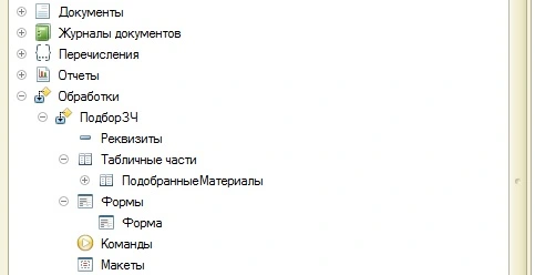 3. Добавим новую обработку «ПодборЗЧ» с табличной частью «ПодобранныеМатериалы».