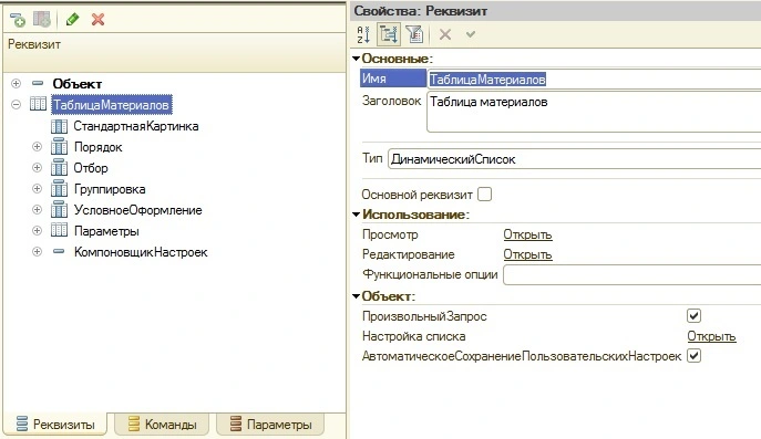 5. Создадим динамический список «Таблица Материалов» с признаком «ПроизвольныйЗапрос».