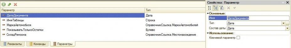 СписокСвойств = "ПоказыватьТолькоОстатки, МаркаАвтомобиля, ДатаДокумента,СкладРемзона";