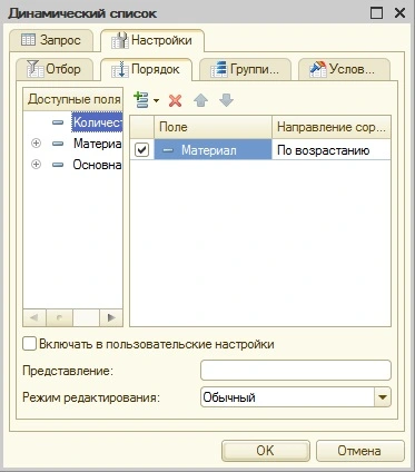 Откроем настройку списка и с помощью конструктора запроса (или вручную) создадим запрос: выборку материалов(зап.частей) из справочника и нашего регистра накопления. Если есть необходимость -на вкладке динамического списка "Настройка" - настроим поля.