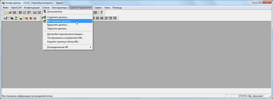 5. Попадаем в Конфигуратор 1С. В меню выбираем «Администрирование» -> «Восстановить данные».