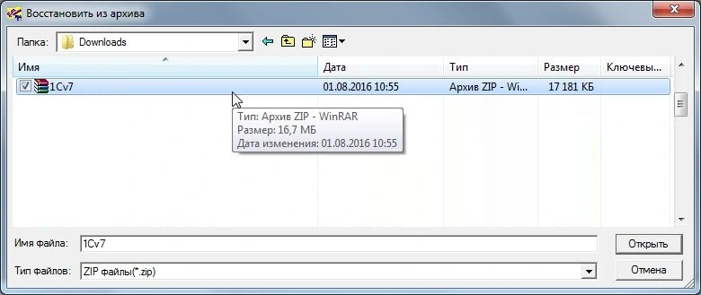 Выбираем наш архив базы данных 1Cv7.zip и нажимаем «Открыть».