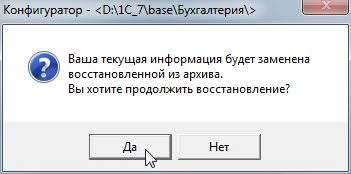8. Программа 1С выдаст вопрос «Ваша текущая информация будет заменена восстановленной из архива. Вы хотите продолжить восстановление?». Отвечаем «Да».