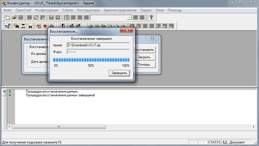 Инструкция по восстановлению базы данных 1С 7.7 из архива 1Cv7.zip