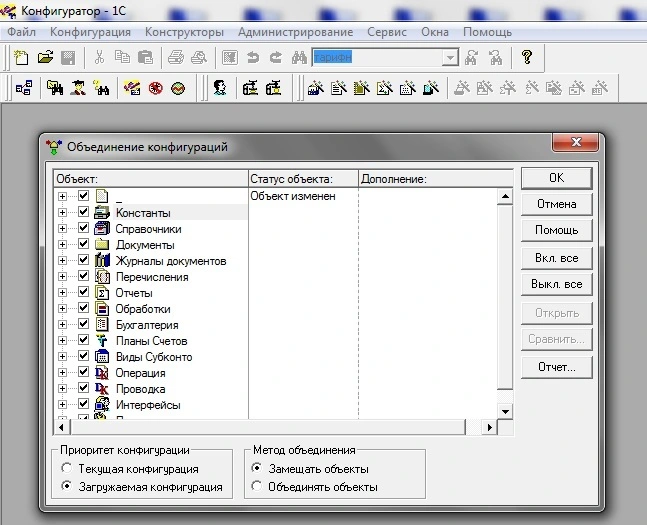 В окне режима "Объединение конфигураций" проверьте, в группе "Приоритет конфигурации" должен быть установлен переключатель "Загружаемая конфигурация", в группе "Метод объединения" установлен переключатель "Замещать объекты". Нажмите кнопку "OK" для объединения конфигураций 1С. После завершения будет открыто окно "Конфигурация", содержащее конфигурацию с внесенными изменениями.