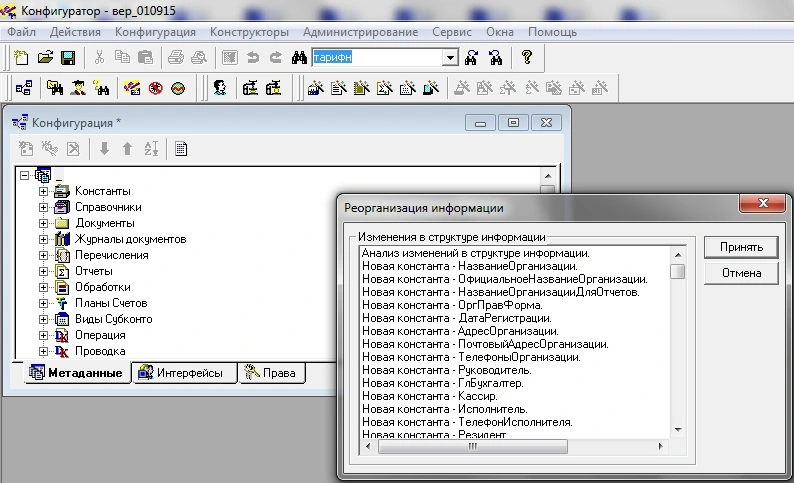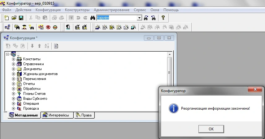 На экране появится предупреждение: "Реорганизация информации закончена!".Обновление конфигурации выполнено.