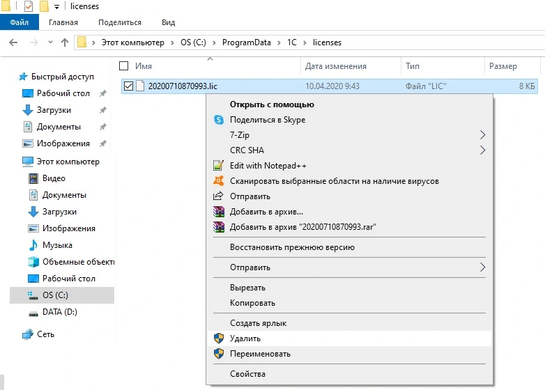 Как удалить программную лицензию в 1С 8.3?
