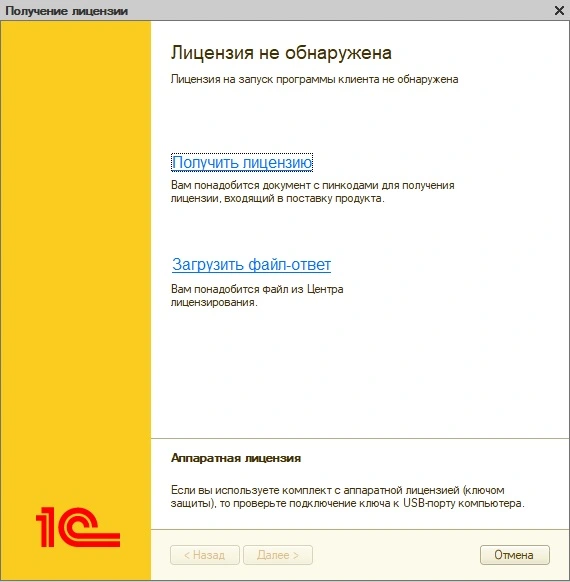 После удаления лицензий, при запуске 1С Предприятия 8.3 в любом режиме, Вы получите окно, свидетельствующее об отсутствии программных лицензий на данном компьютере.