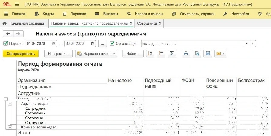 Доработанный типовой отчет, позволяющий строить аналитику по налогам и взносам в разрезе подразделений. В отчете есть возможность разворачивать/сворачивать группы и фильтровать по: Организациям, Подразделениям, Физическим лицам. Добавляется в 1С ЗУП 3.0 для Беларуси как внешний отчет: Администрирование - Печатные формы, отчеты и обработки - Дополнительные отчеты и обработки - Создать. Отчет протестирован на 1С:Зарплата и Управление Персоналом для Беларуси, редакция 3.0. Локализация для Республики Беларусь: СООО "1С-Минск" (версия 3.0.18.190)