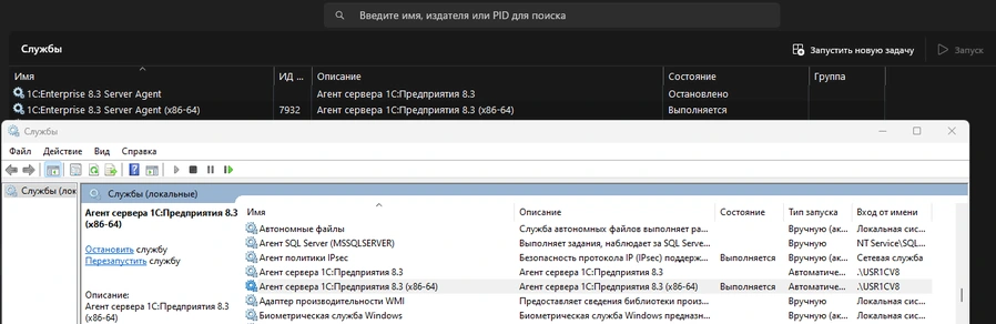 🔸 Закрываем все режимы 1С и останавливаем службу 1C:Enterprise 8.3 Server Agent (x86-64).