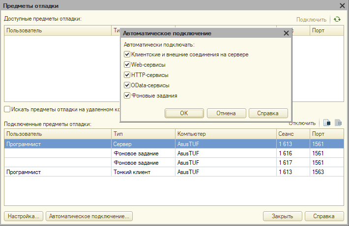 Конфигуратор - Отладка - Подключение... - Автоматическое подключение - И поставить везде ✓