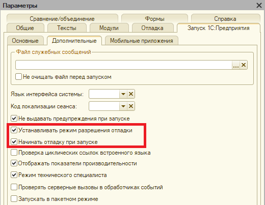 Конфигуратор - Сервис - Параметры - Запуск 1С:Предприятия - Дополнительные: