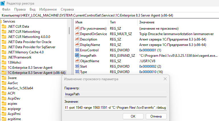 🔸 В значение ImagePath добавляем параметр "/debug". У меня получилась строка "C:\Program Files\1cv8\8.3.25.1336\bin\ragent.exe" -srvc -agent -regport 1541 -port 1540 -range 1560:1591 -d "C:\Program Files\1cv8\srvinfo" /debug