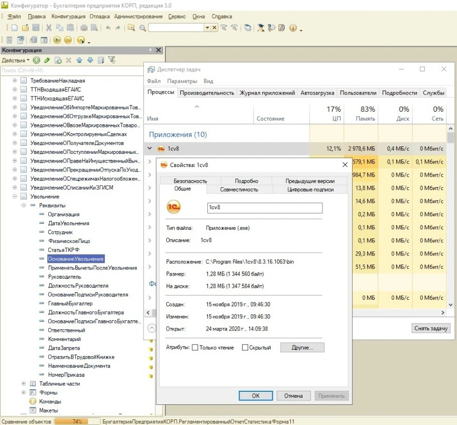- Запуск обновления с "C:\Program Files (x86)\1cv8\8.3.XX.XXXX\bin\1cv8.exe" выдаст ошибку "Недостаточно памяти"