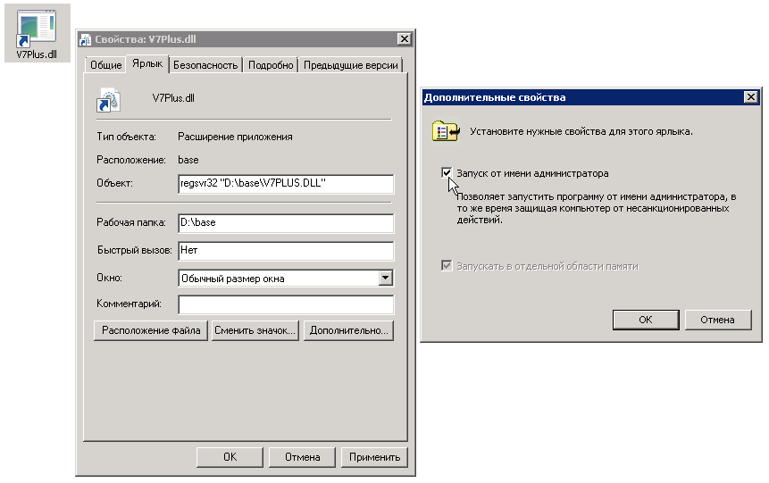 !!! На компьютере находим нужный файл v7plus.dll. Для найденного файла создаем ярлык и выносим его на рабочий стол. Правой кнопкой мыши вызываем свойства этого ярлыка. В свойствах на закладке "Ярлык" в окне "Объект" перед путем к файлу вставляем команду regsvr32 (помним, что путь должен быть в двойных кавычках). На этой же закладке свойств ярлыка жмем на кнопку "Дополнительно". В открывшемся диалоге устанавливаем флажок "Запуск от имени администратора" и сохраняем внесенные изменения.