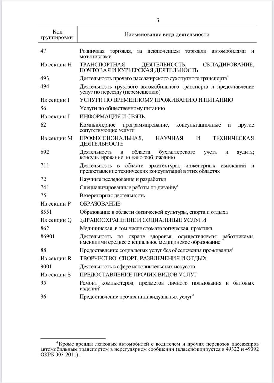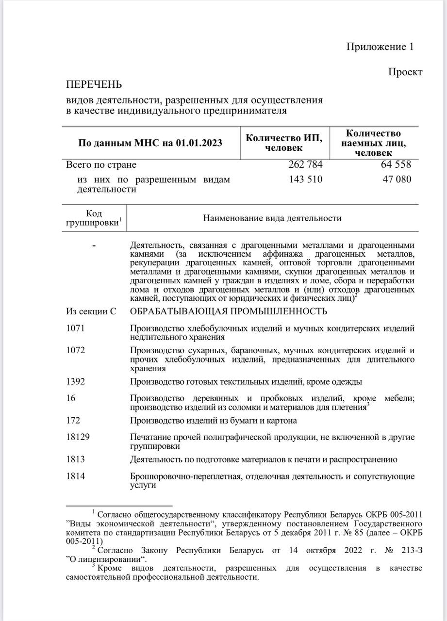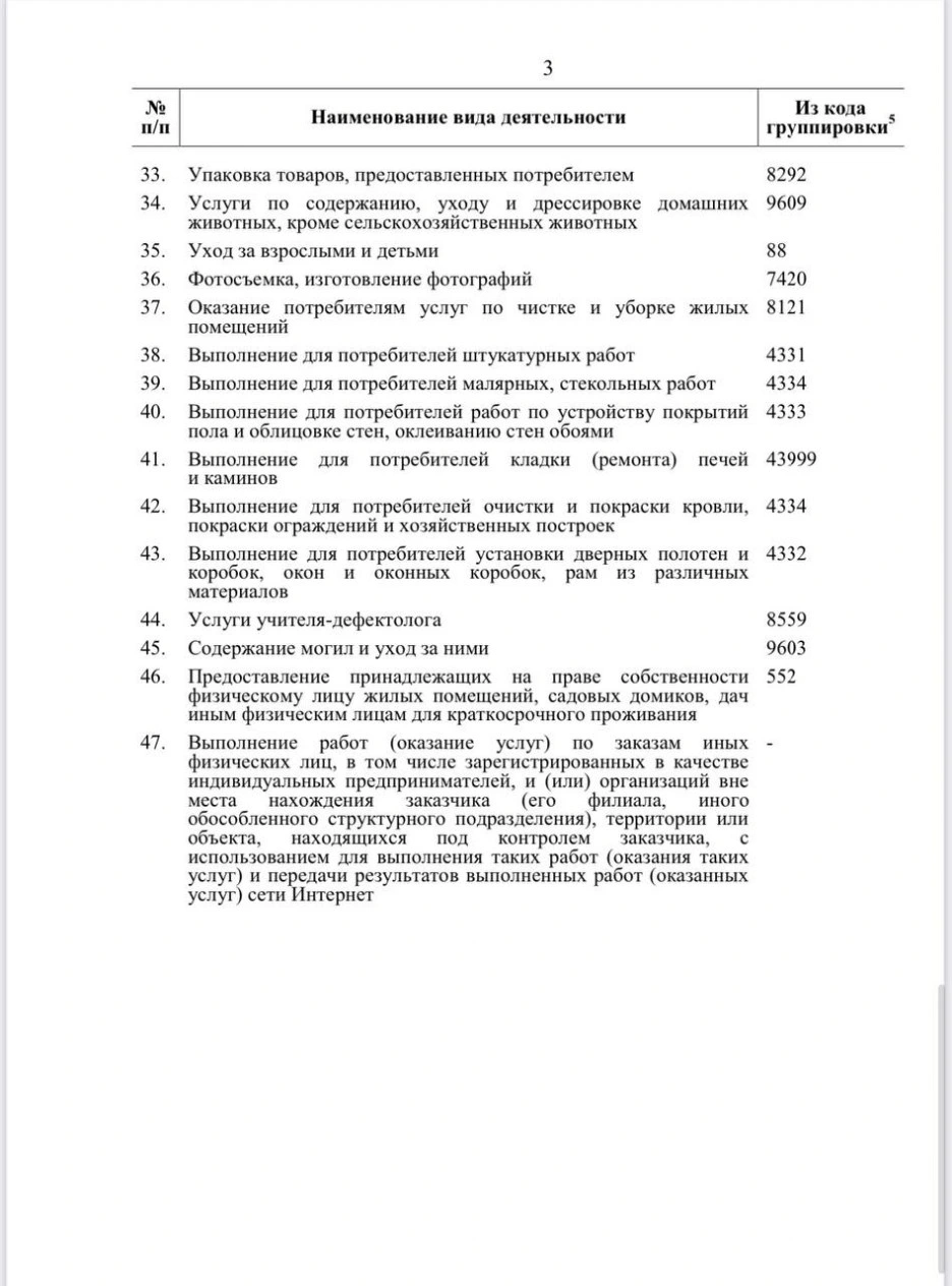 Проект в котором указан перечень видов деятельности, разрешенных для индивидуальных предпринимателей и самозанятых