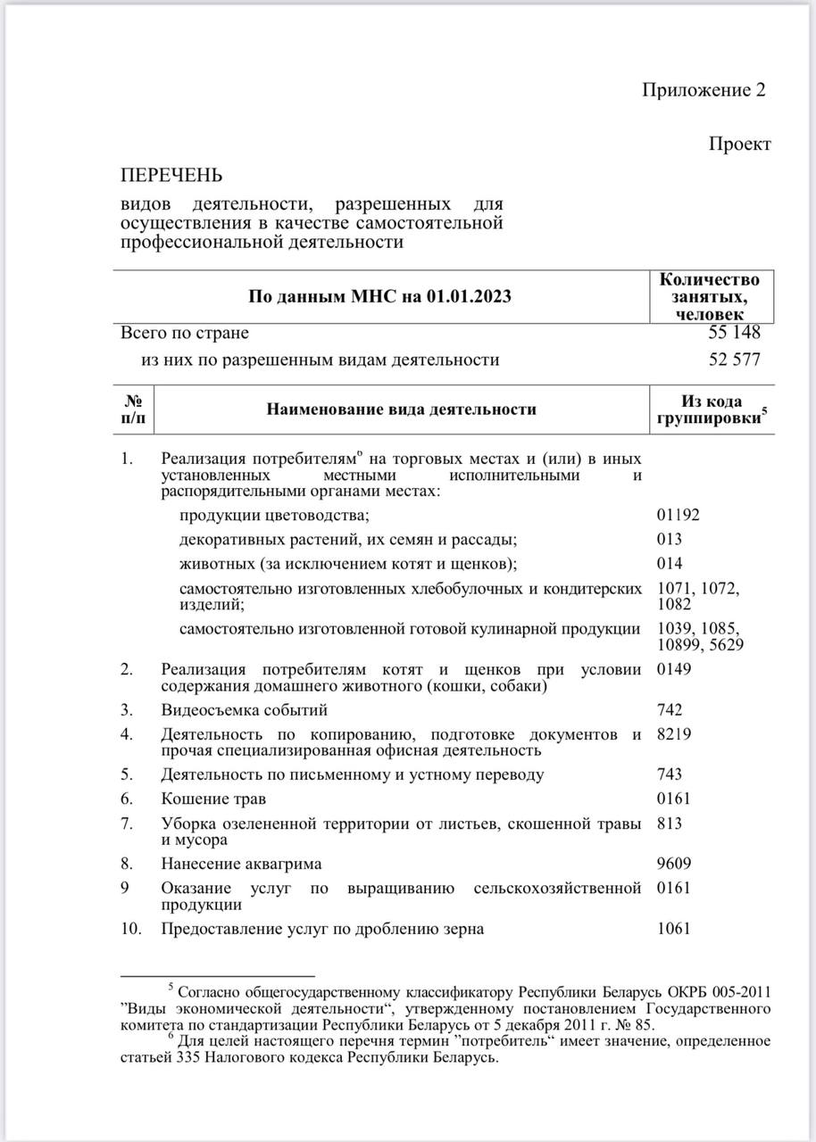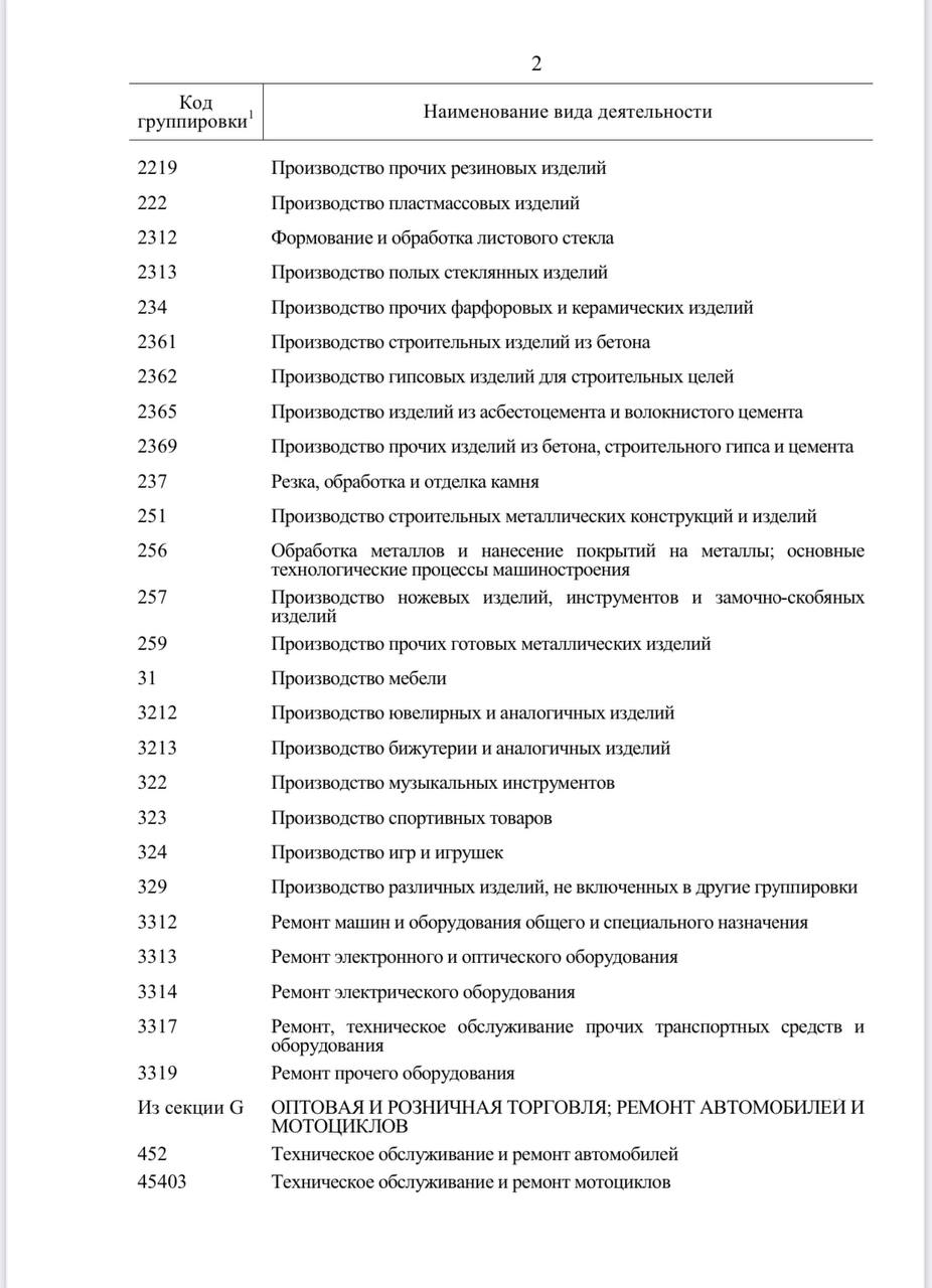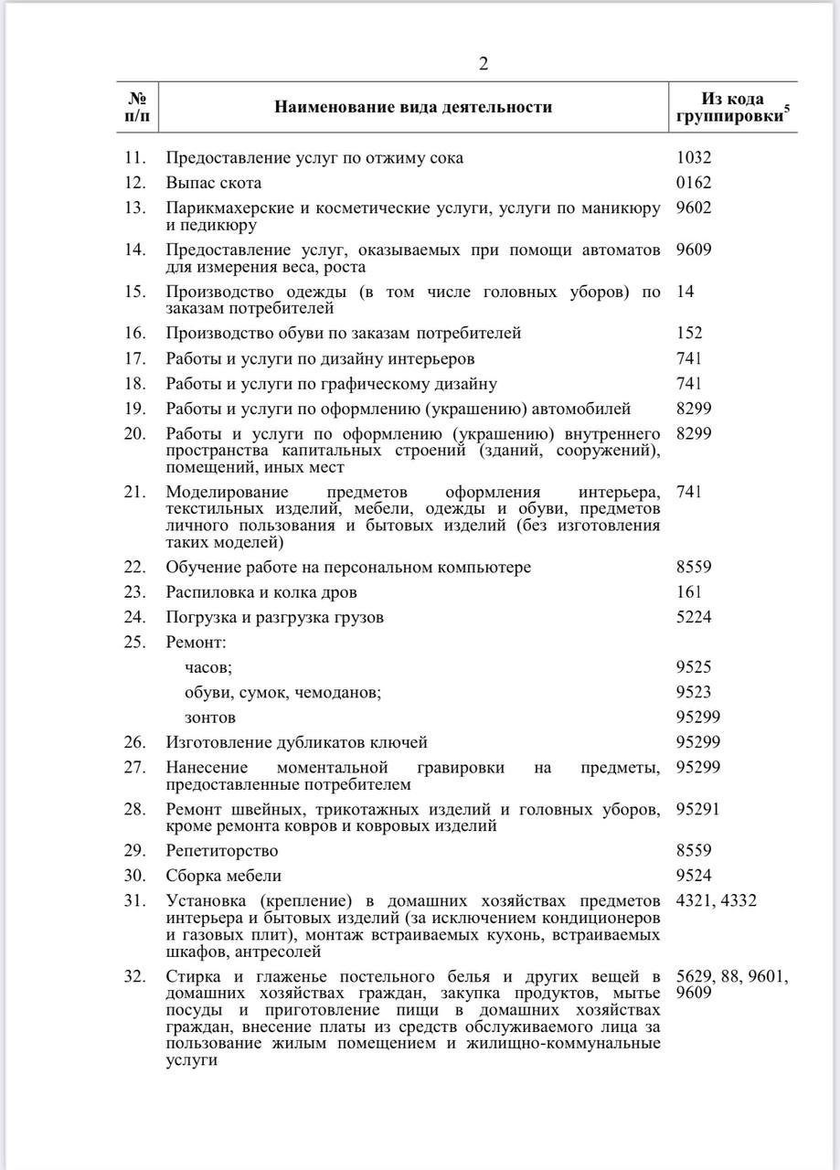 Проект в котором указан перечень видов деятельности, разрешенных для индивидуальных предпринимателей и самозанятых