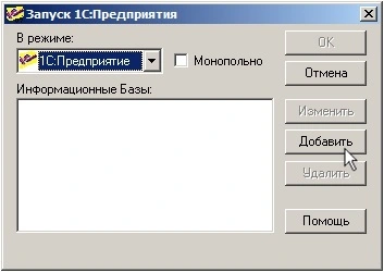 Перед Вами откроется окно со списком информационных баз. В данном случае оно пустое