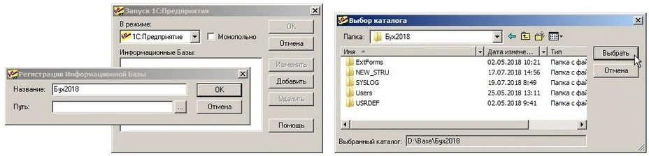 ). Выбираем папку (каталог) базы данных, например: Мой компьютер - Локальный диск D: - base - Бух2018. ВАЖНО! В папку с базой данных нужно войти! Вы должны увидеть каталоги ExtForms, usrdef, NEW_STRU и другие... И только тогда нажать кнопку "Выбрать"