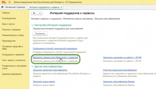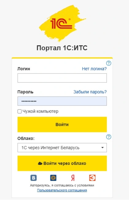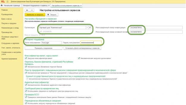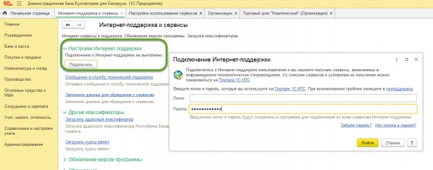 Важно! В конфигурации Бухгалтерия для Беларуси поля для указания логина и пароля интернет-