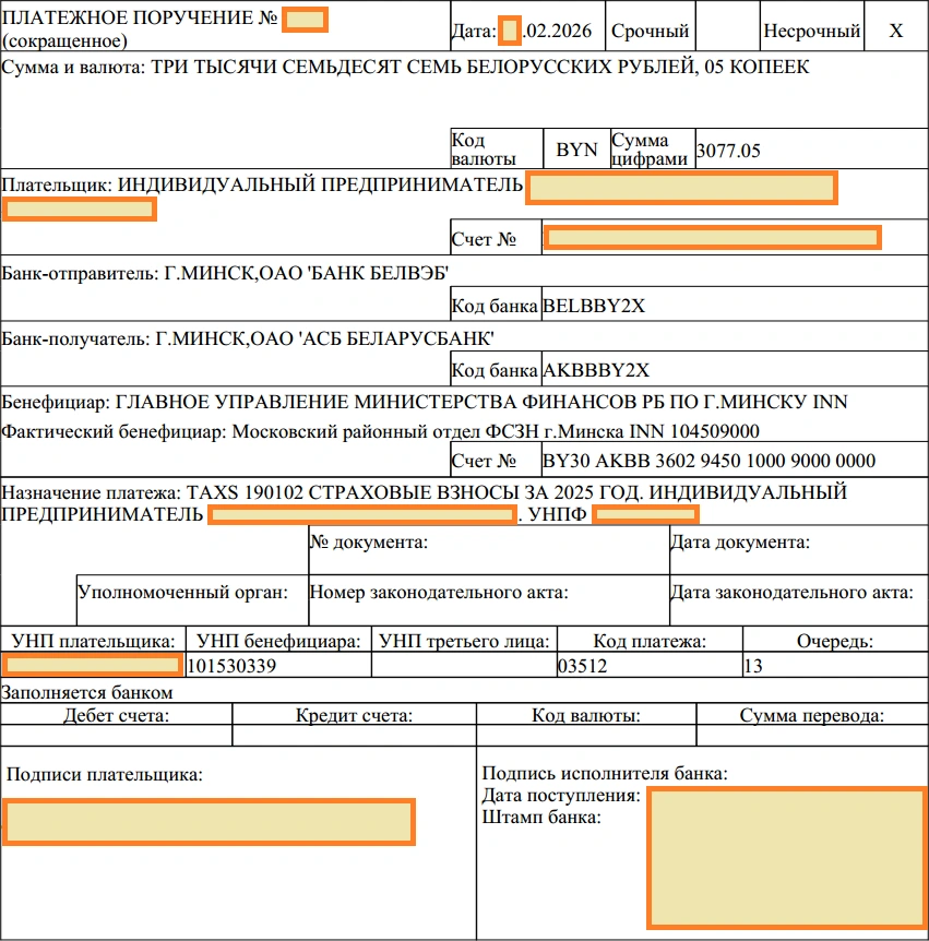 Назначение платежа: СТРАХОВЫЕ ВЗНОСЫ ЗА 2025 ГОД. ИНДИВИДУАЛЬНЫЙ ПРЕДПРИНИМАТЕЛЬ <ВАШЕ ФИО>. УНПФ <ВАШ УНПФ>