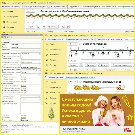 Расширение с назначением "Дополнение". Не забудьте отключить безопасный режим. Возможно в расширении придётся подредактировать общие модули под свою конфигурацию и/или исправить режим совместимости интерфейса. Новогодняя тематика в журналах документов будет радовать пользователей с 16.12.ГГГГ по 20.01.ГГГГ. "Заставка" при запуске, отключается вручную в свойствах расширения "НовыйГод". Если захотите поменять картинку - сожмите/обрежьте её до размера 602 х 256. Предложения пишите в комментариях на этой странице или в посте: