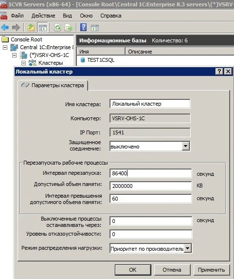 3)      В свойствах "Локального кластера заполняем графы. У меня на сервере установлены следующие параметры:
