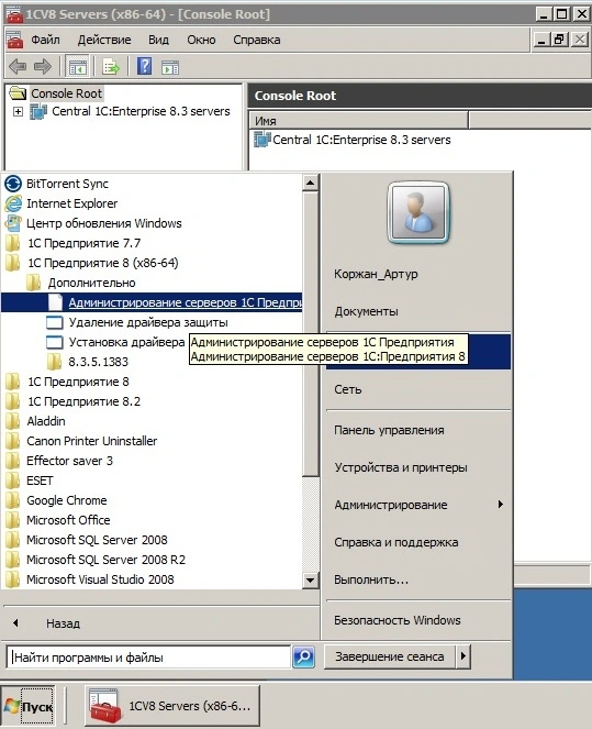 1)      Выполняем на Windows Server: Пуск - 1C Предприятие 8 (x86-64) – Дополнительно - Администрирование серверов 1С Предприятия.