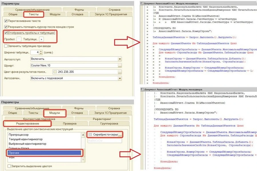 По стандартам (#std456), тексты модулей должны быть оформлены с синтаксическими отступами.Причем, для отступа нужно использовать именно символ табуляции, а не пробелы. Чтобы во время разработки «видеть» и пробелы и табуляции, можно настроить Отображение пробелов и табуляций в Параметрах. Информативно, полезно, но… слишком уж эти символы бросаются в глаза. Что можно сделать? Опять же, в Параметрах, настроить для них цвет.