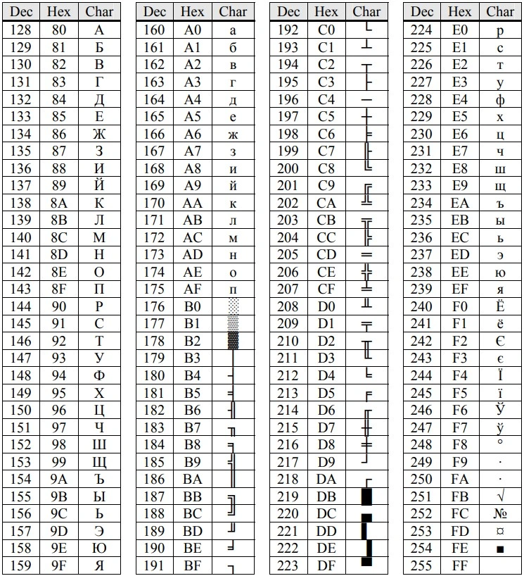 Таблица символов ASCII (от 128 до 255)