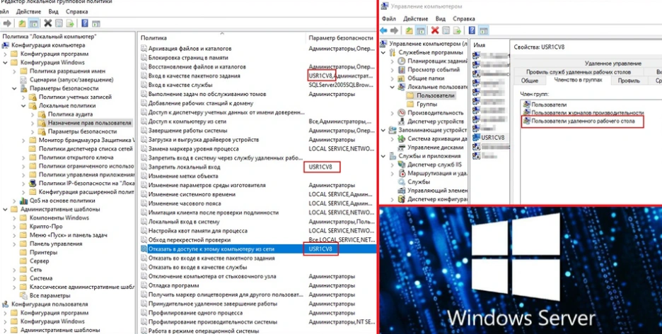 Иногда для корректной работы 1С требуется, чтобы серверная служба 1С (учётная запись USR1CV8) имела доступ к сетевым папкам или дискам, защищённым аутентификацией. Самый надёжный способ это войти на сервер под этой учётной записью через RDP, подключиться к ресурсу с сохранением пароля. После этого служба сможет работать с файлами даже после перезагрузки сервера. Учётная запись USR1CV8 по умолчанию исключена из политик безопасности для удалённого доступа. Давать ей постоянные права на RDP это серьёзная угроза безопасности. Все действия выполняются только на время настройки доступа, после чего конфигурация немедленно возвращается в исходное состояние.