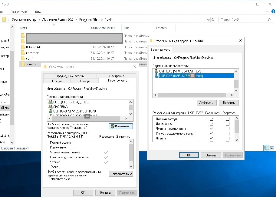 - желательно предоставить доступ к папке журнала регистраций 1С — srvinfo (см.скриншот 2).