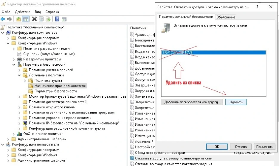 - запретить локальный вход для этой учётной записи на всех серверах и на компьютерах (см.скриншот 1). Жмем Win + R и вводим команду: gpedit.msc в диалоговом окне Выполнить, далее Enter. Политика Локальный компьютер\Конфигурация компьютера\Конфигурация Windows\Параметры безопасности\Локальные политики\Назначение прав пользователя\Отказать в доступе к этому компьютеру из сети удалить из списка USR1CV8;